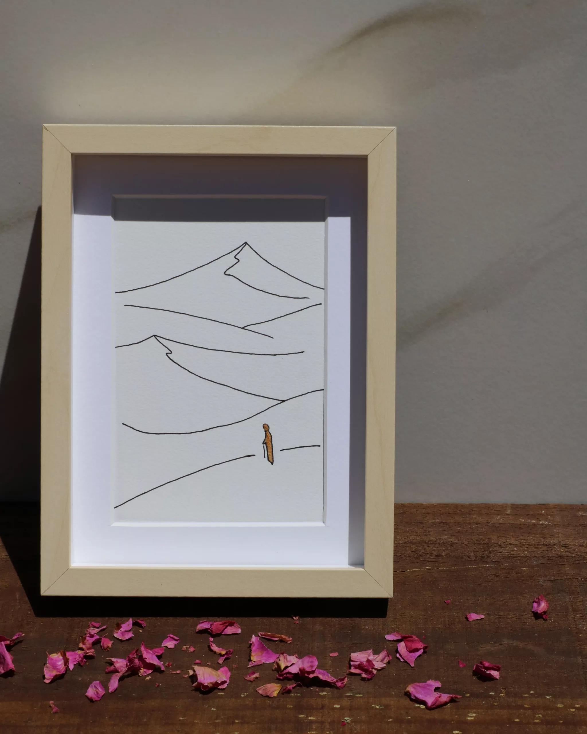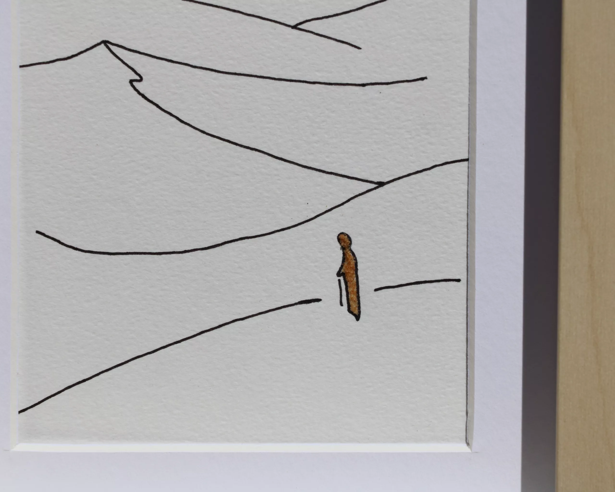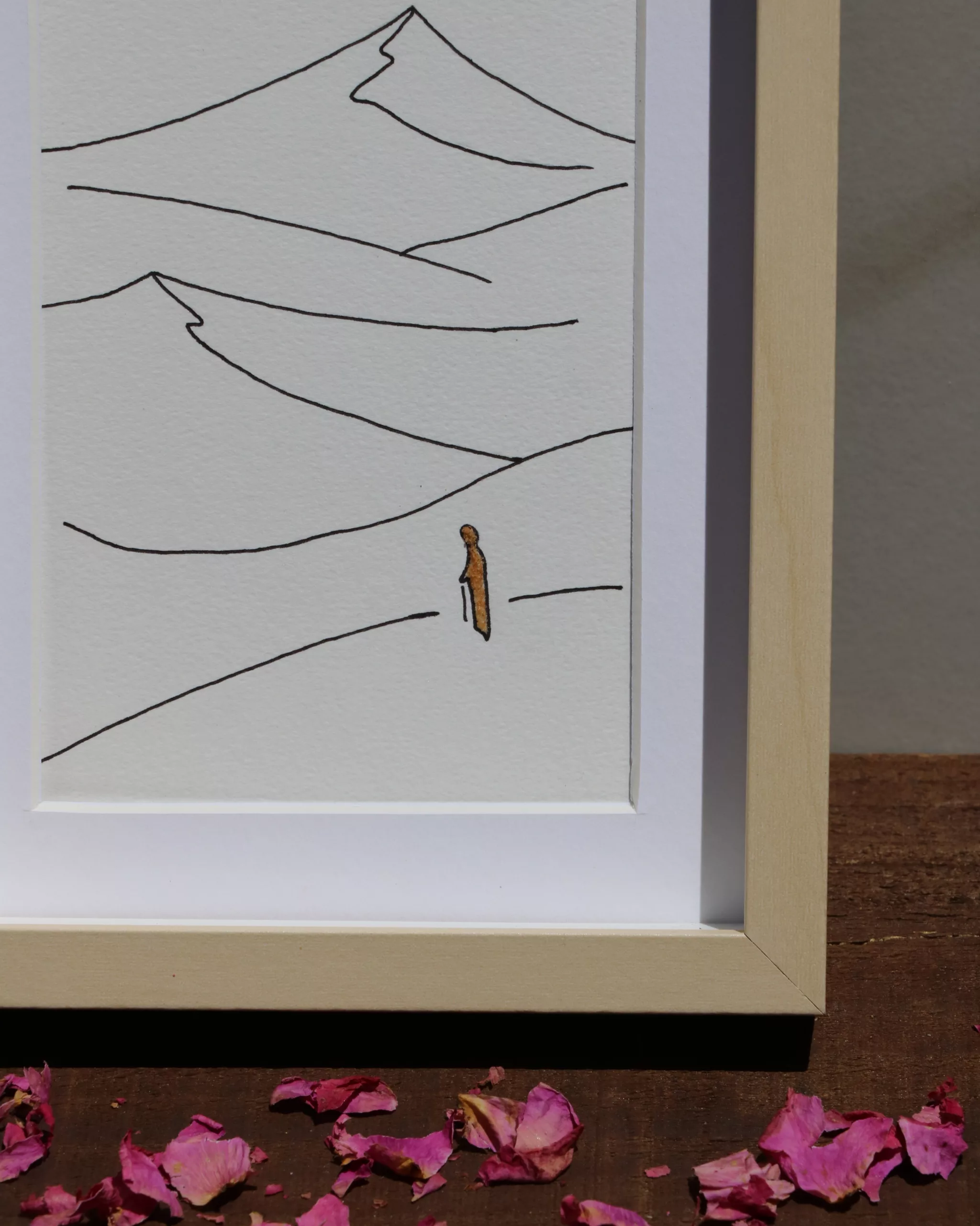 Obra original en papel de 300g libre de ácido, aportando mayor durabilidad y mejor preservación. Ilustración siguiendo la técnica del arte lineal y arena del desierto de Merzouga (Marruecos).