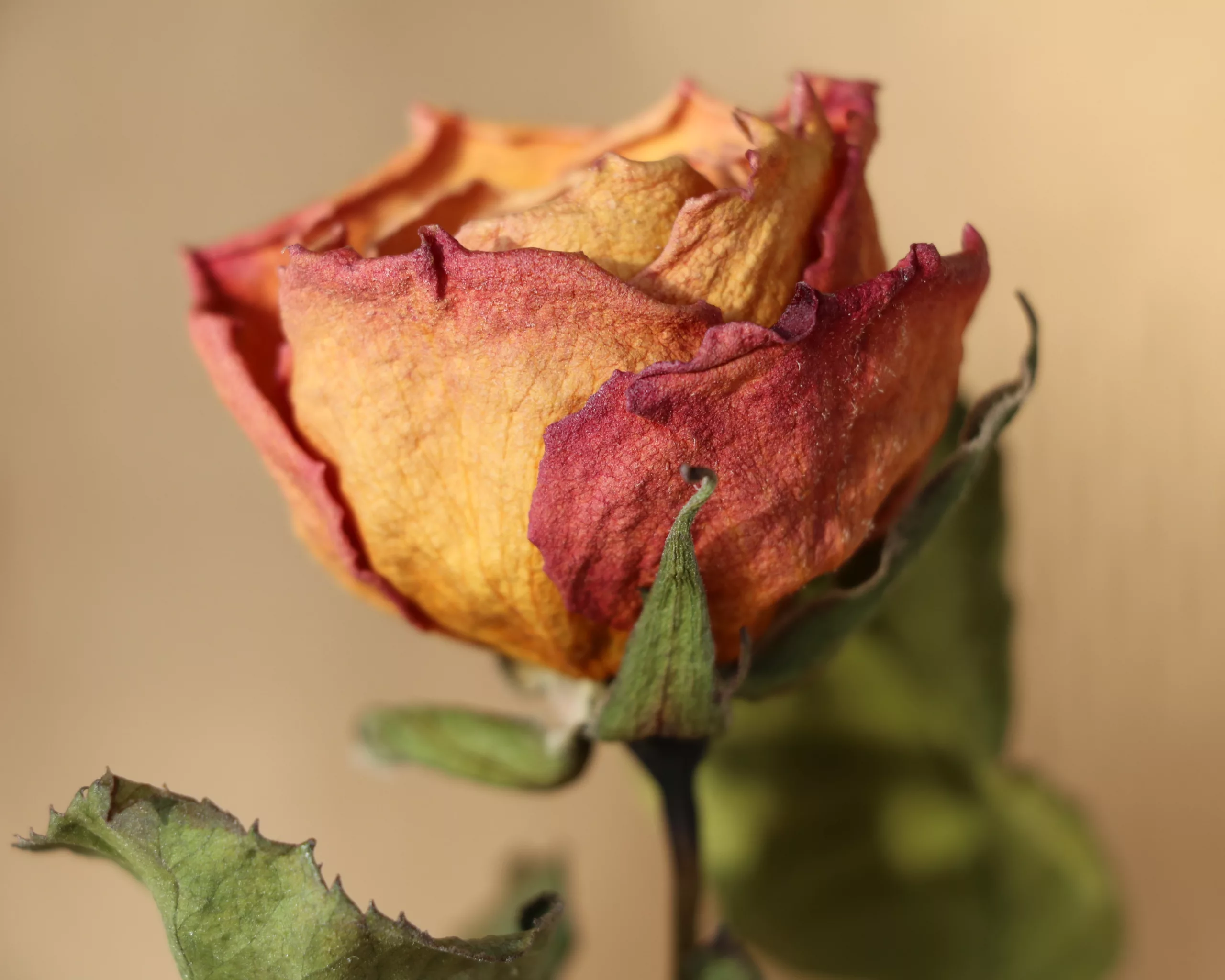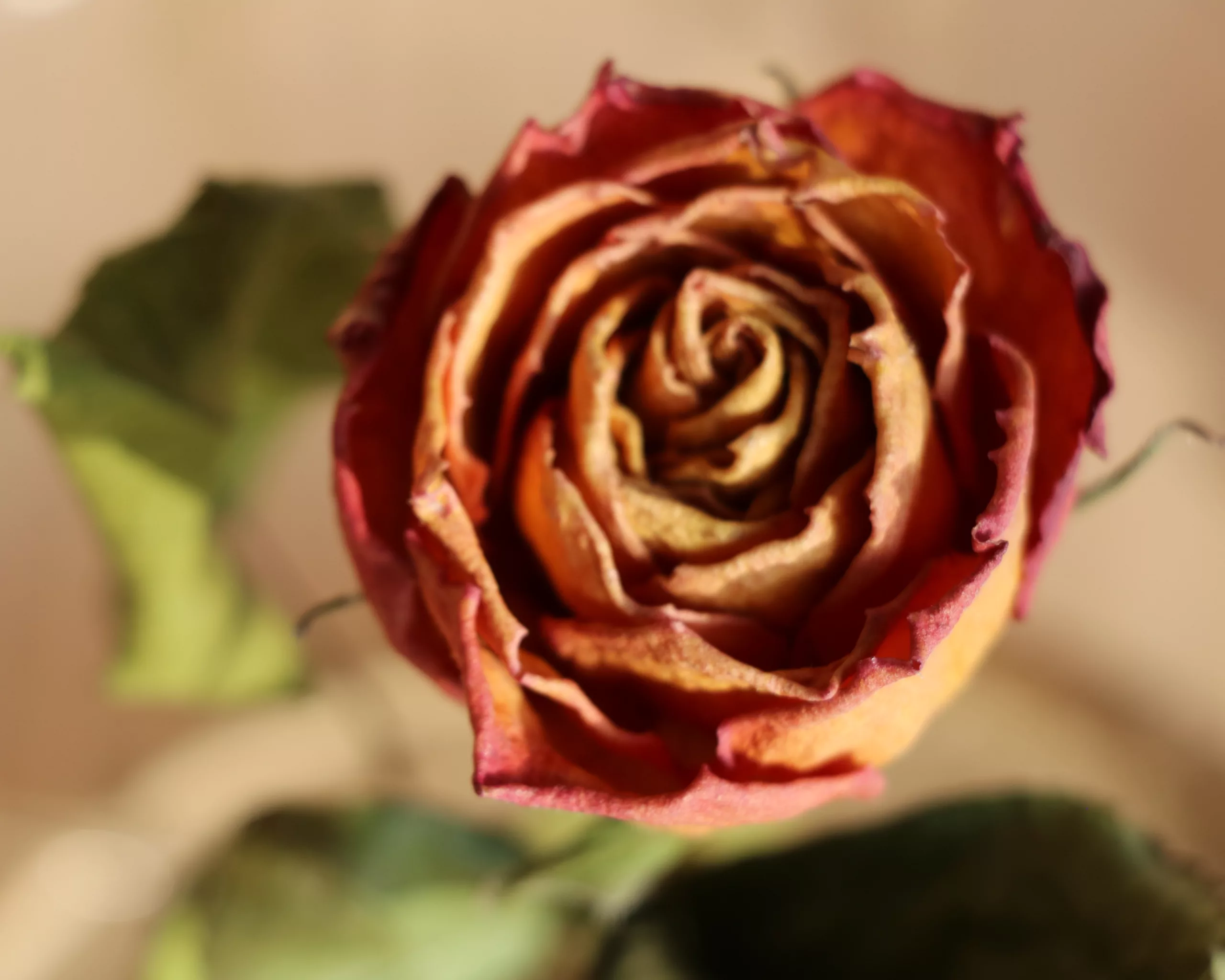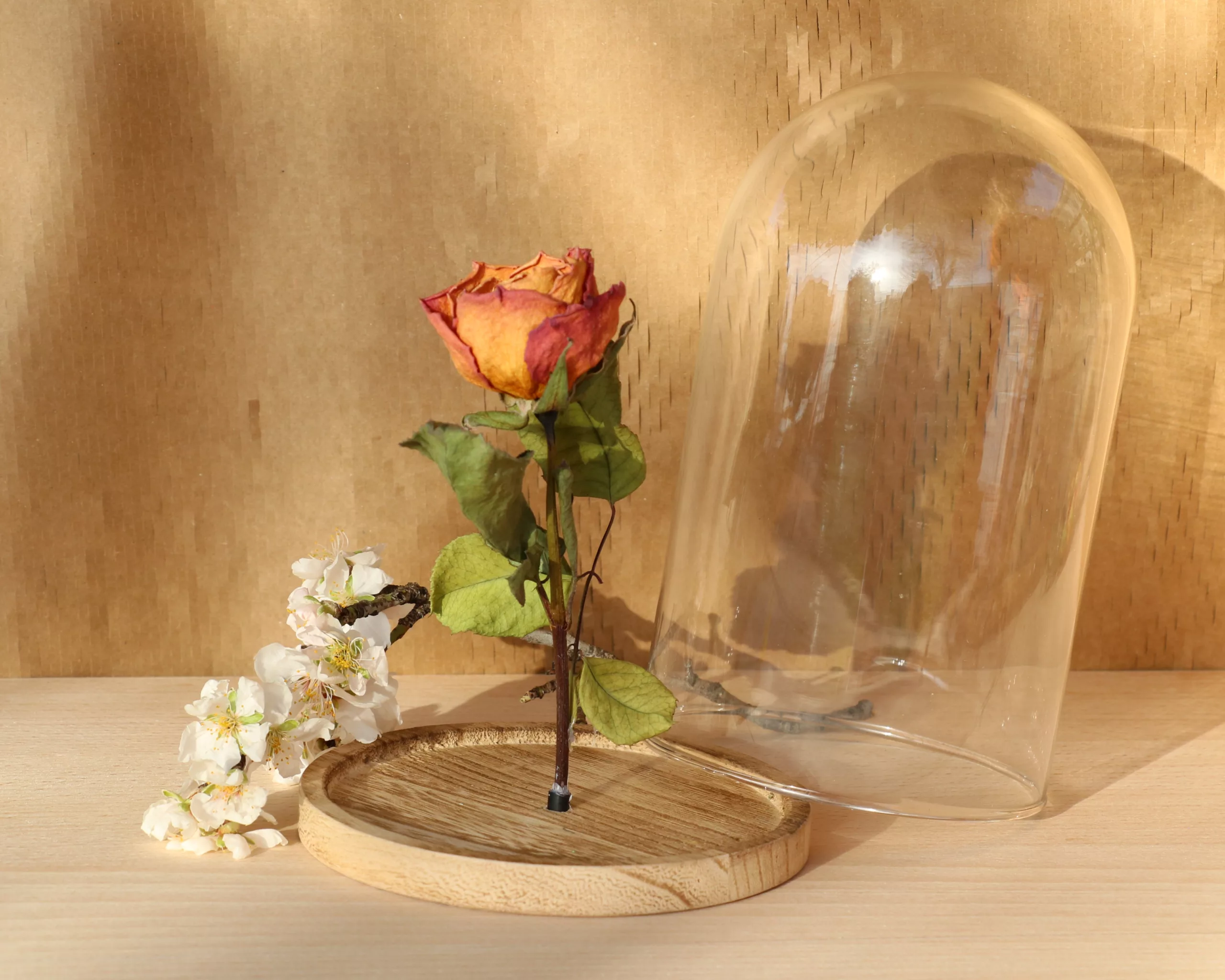 Rosa desecada en cúpula de cristal de 30 cm con base de madera.