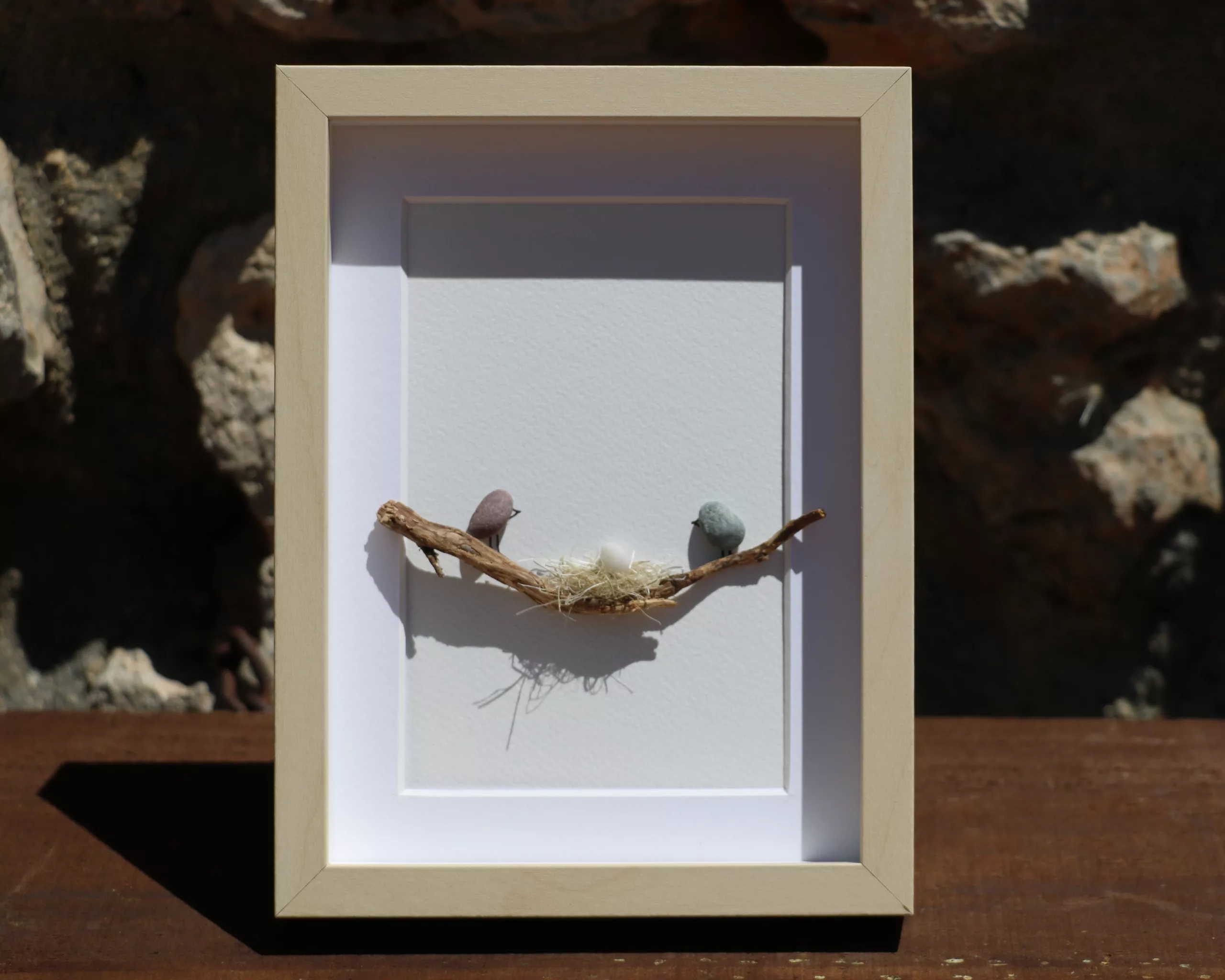 Con marco efecto abedul tipo vitrina. Puede colgarse directamente o colocar sobre una superficie.