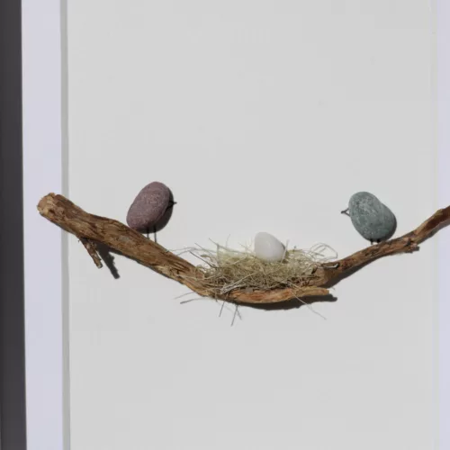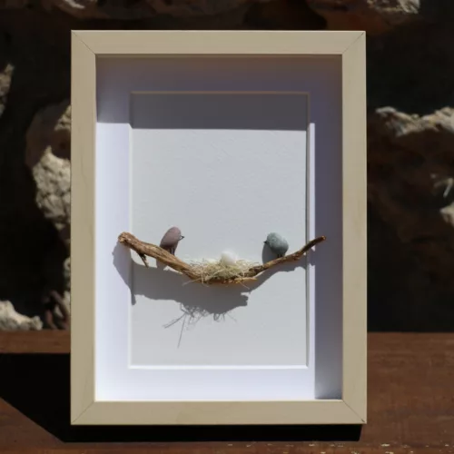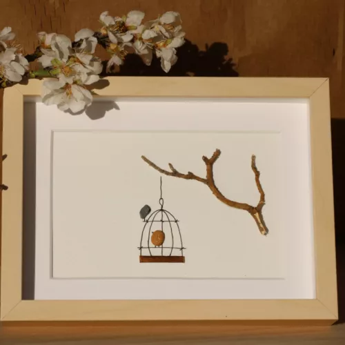 Con marco efecto abedul tipo vitrina. Puede colgarse directamente o colocar sobre una superficie.