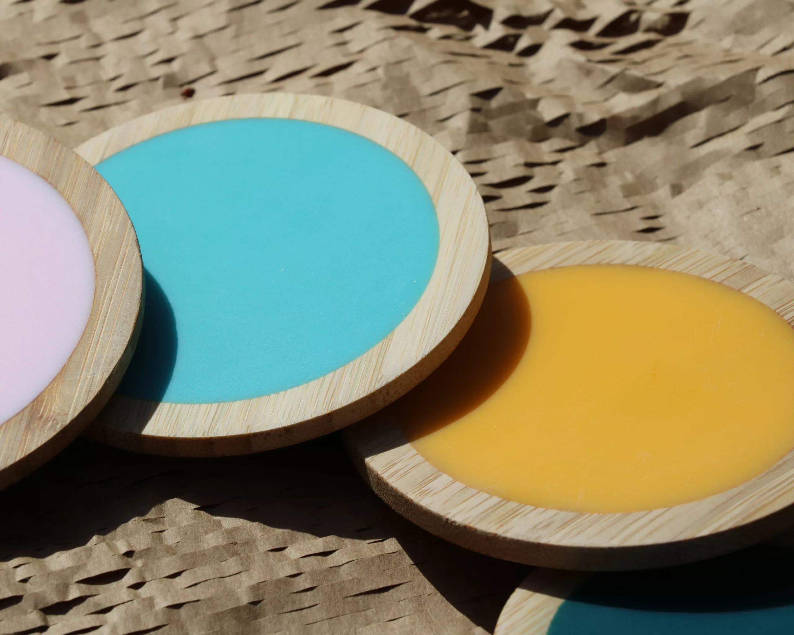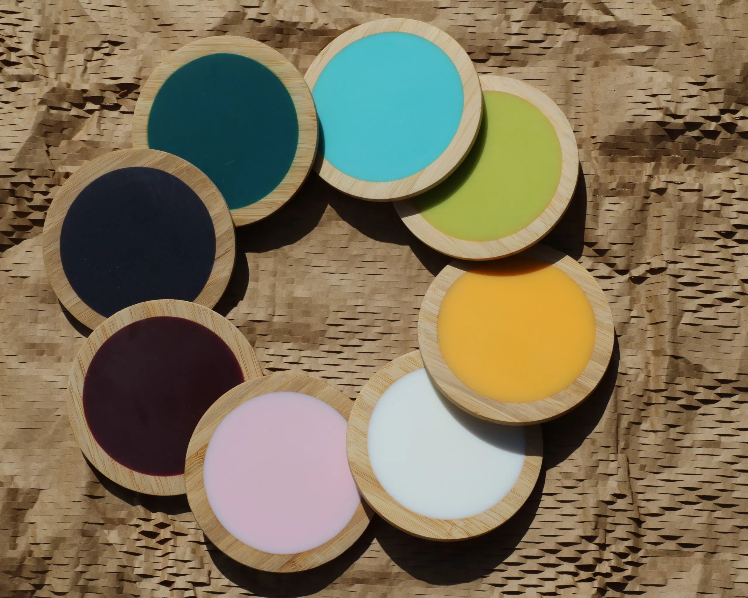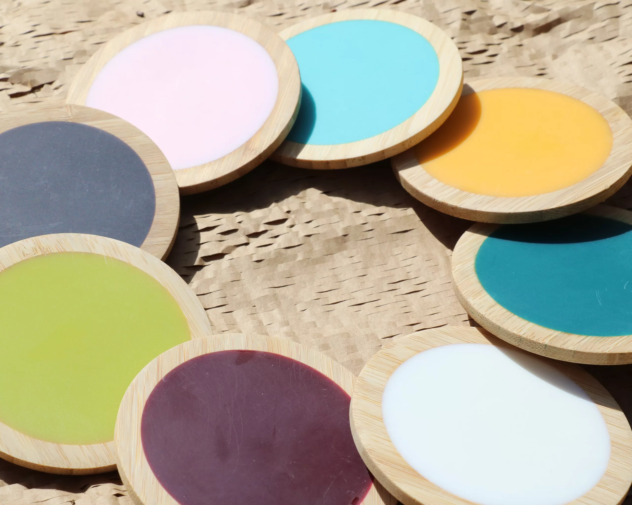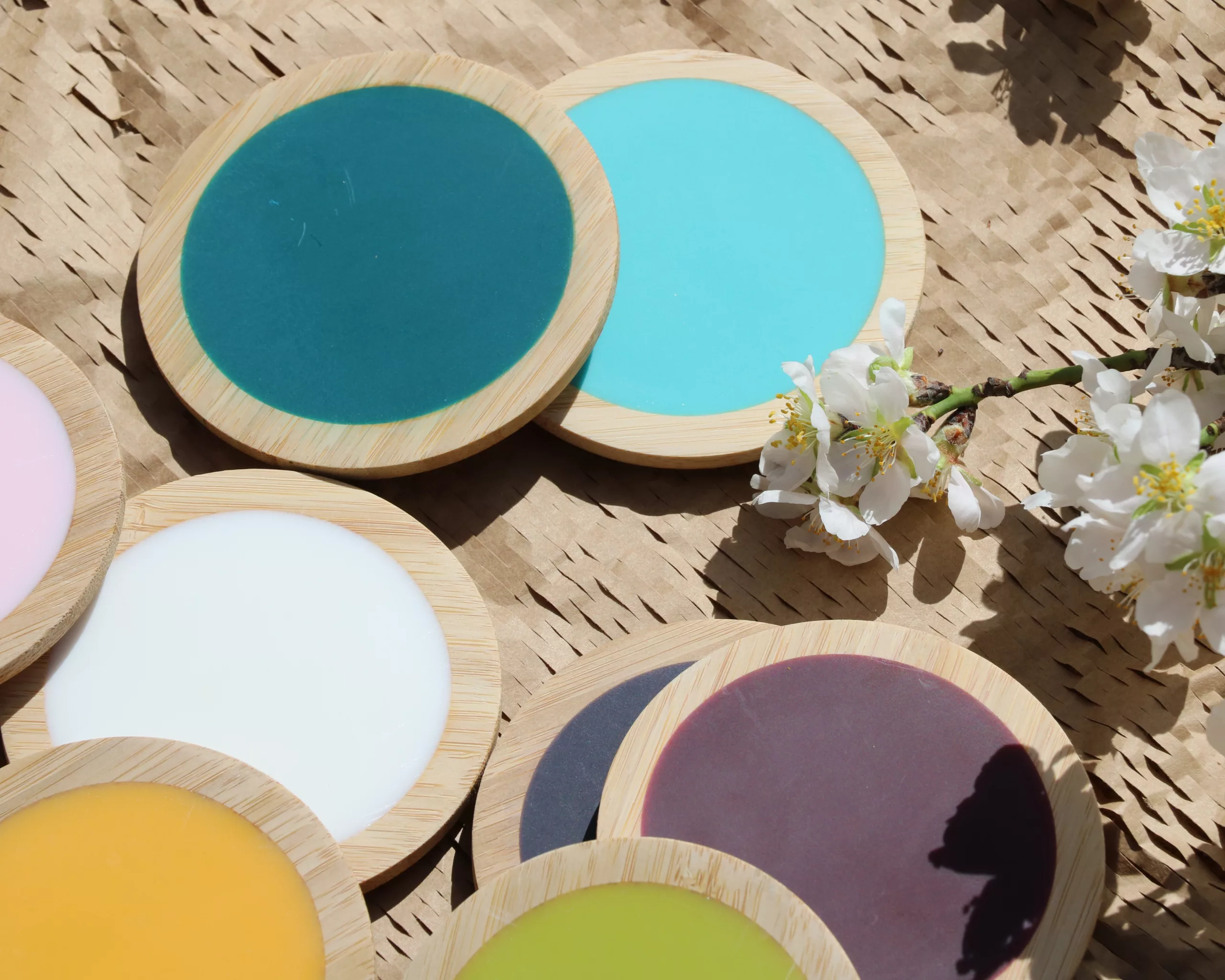 Posavasos en base de madera. Elaborados con resina epoxi en tonos pastel y un acabado mate.